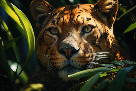 Portrait of tiger in tropical jungle leaves and plants, created using generative ai technology. Wild animal, wildlife, nature and beauty in nature concept digitally generated image.