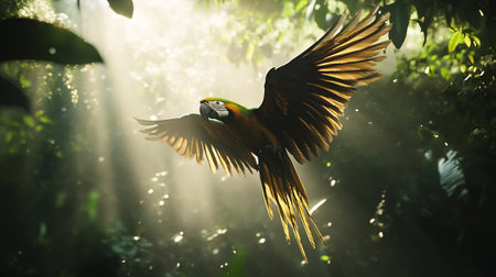 A group of colorful parrots with outstretched wings flies through a lush tropical jungle, illuminated by rays of sunlight filtering through the trees.