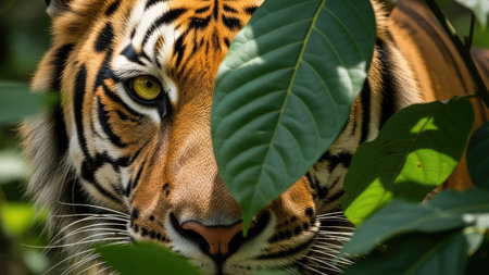 Close-Up of Tiger's Eyes with Jungle Foliage Background ai generated