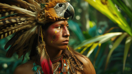 A proud indigenous warrior adorned with a vibrant feather headdress and body paint stands amidst the dense greenery of a tropical rainforest.