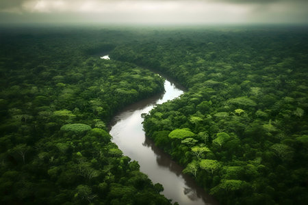 Featuring a aerial view of the amazon rainforest and river, lush greenery, wildlife. a masterpiece of nature photography