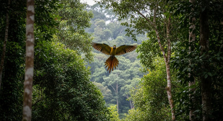 a parrot mimicking sounds in the dense jungle, created with generative ai