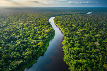 Stunning aerial view of the Amazon rainforest with a winding river.