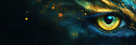 Intricate details showcase a mythical creatures eye with gold and green hues amidst a dark, vibrant background creating a magical effect.