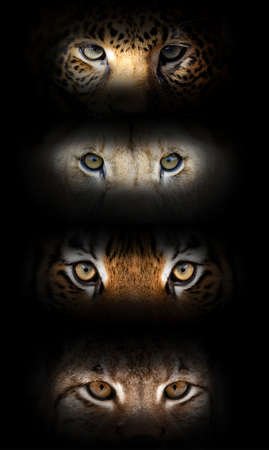 Wild cats (leopard, lion, tiger, lynx) portrait on a black background. View from the darkness