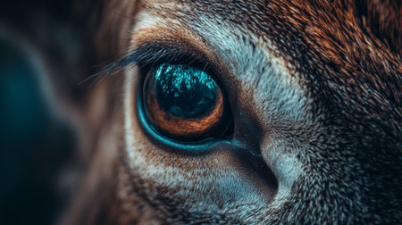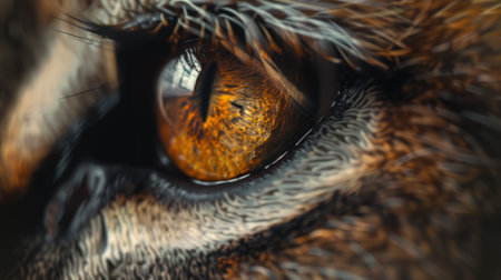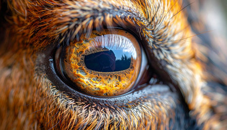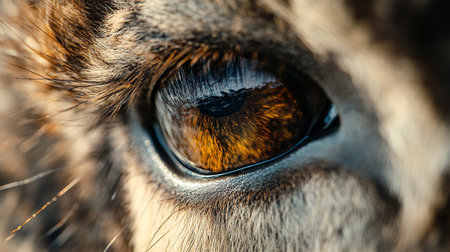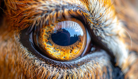 An extreme macro photograph captures the intricate details of a goats eye. The golden and amber iris reveals a complex pattern, while the unique horizontal pupil reflects the world with stunning clarity, inviting contemplation on natures incredible design and the focused gaze of wildlife.