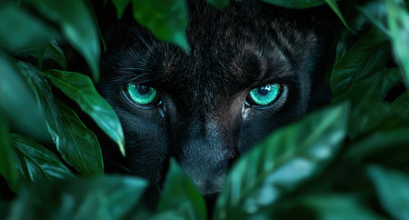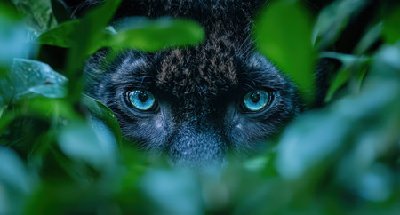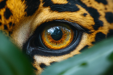 Intense focus on a leopard's eye, vivid colors and intricate patterns. the close-up perspective feline gaze through the green foliage, showcasing the beauty of wildlife and nature. Generative AI