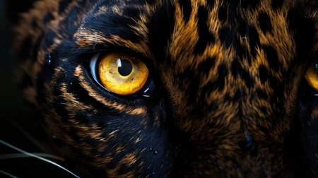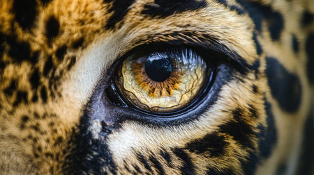 Close-up of a jaguar's eye, showcasing the intricate and colorful patterns in the iris, capturing attention with its beauty.