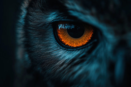 An owl's eye catches vibrant orange hues at dusk, highlighting its intricate feathers and deep emotions.