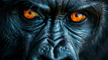 Intense gorilla face portrait with orange eyes against a dark background in stunning detail