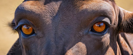 Animal cattle striking orange eyes gazes intensely at viewer, exuding an air mystery and intrigue - grazing cattle