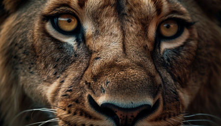 Majestic lion staring at camera, fur and mane in focus generated by artificial intelligence
