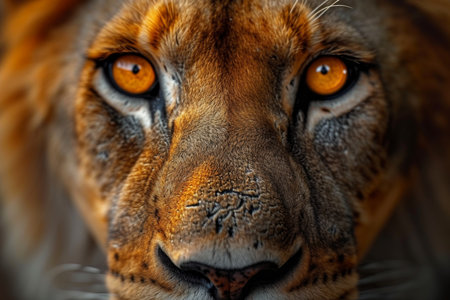 Lion eyes reveal vibrant amber color and powerful expression. Animal is calm yet alert, embodying its wild nature amidst greenery. Detailed fur and fierce gaze in a natural habitat. Generative AI