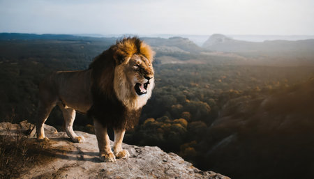 A grand lion lets out a mighty roar, its mane illuminated with golden hues against a dark backdrop, embodying strength and regal presence at twilight.