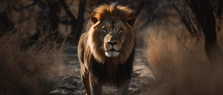 Majestic lion captured in its natural habitat, surrounded by tall grass and trees. Generative AI