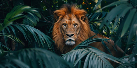 A lion is standing in a jungle with green leaves