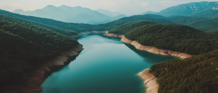 A river meanders through a dense, green forest, under a hazy, overcast sky. The landscape features rolling hills and the water's edge, creating a naturalistic composition. The image presents various textures, from the flowing water to the foliage, and the muted color palette suggests a tranquil setting. Suitable for environmental or travel-themed visuals.