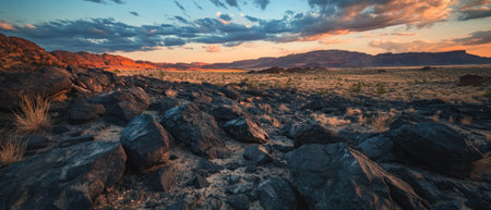 Cinematic sunset over rocky desert landscape with dramatic clouds and fading light
