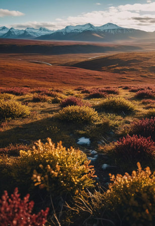 Golden hues intersperse with rich purples as the tundra awakens in autumn. The mountains stand tall against a clear sky, framing a winding river that glimmers in the soft light.