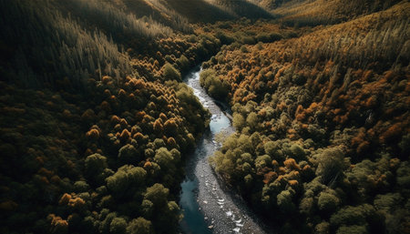 Tranquil autumn forest landscape with yellow leaves and mountain range generated by artificial intelligence