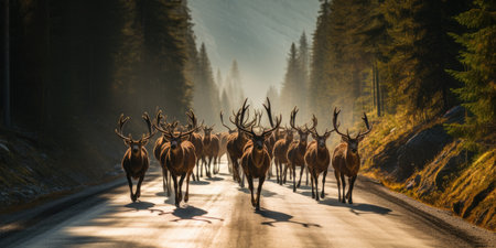 There are a lot of elk on the road. Conservation of wild animals. Safe driving. Generative AI.