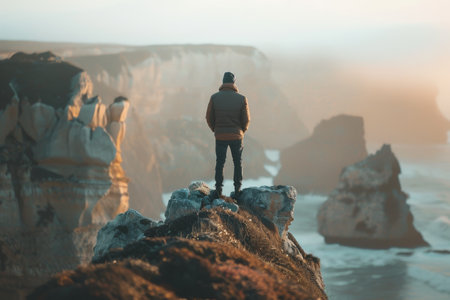 A lone man stands with arms outstretched on a clifftop overlooking a foggy ocean cove. The water crashes against the rocks below, creating a dramatic scene.