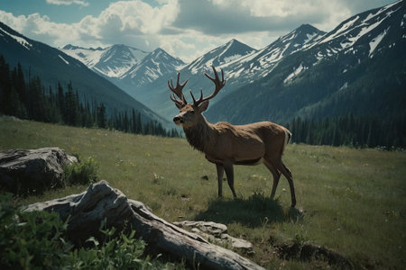 Beautiful wild deer with large antlers in the mountains of Canada