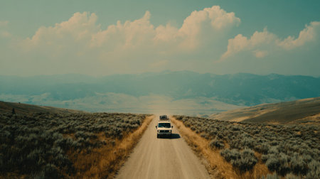 A vehicle travels on a straight rural highway surrounded by vast open landscape
