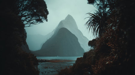 A dramatic and moody landscape view of a majestic mountain peak shrouded in mist, seen through a natural frame of dark, silhouetted trees and foliage over calm water.