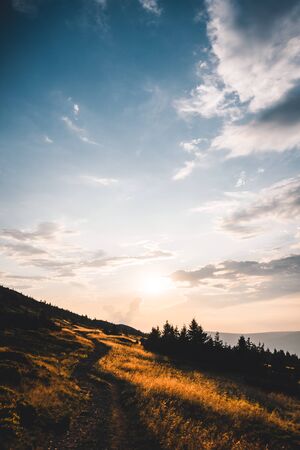 Sunset behind mountains in national park Krkonose, Czech Republic
