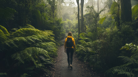 A woman is walking through a forest with a yellow backpack. The forest is lush and green, and the sky is cloudy. The woman seems to be enjoying her walk and taking in the beauty of nature