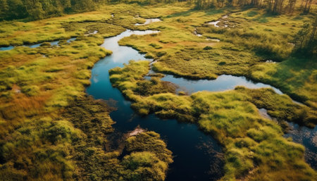 A body of water surrounded by trees on a foggy day. AI generative image.