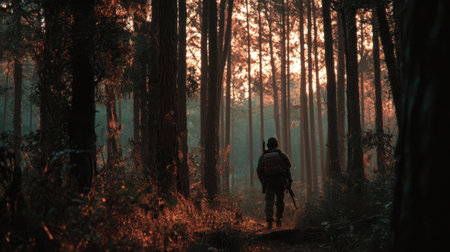 Movie-style shot of a lone armed soldier heading into the quiet forest at sundown, warm cinematic lighting and deep shadows.