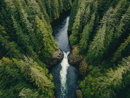 Peaceful river flowing through a dense forest, vibrant green foliage. - ai