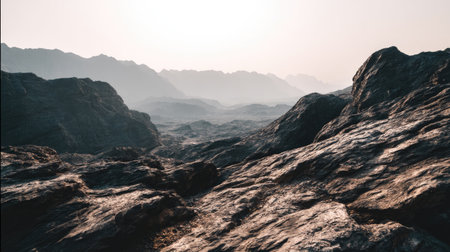 Explore a breathtaking rocky landscape featuring distant mountains and soft horizon light, perfect for capturing the essence of nature and adventure themes.