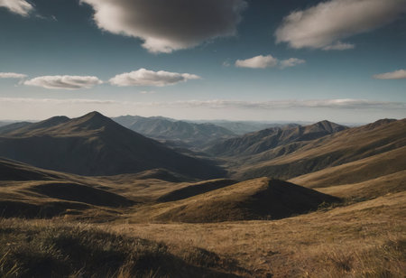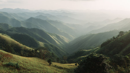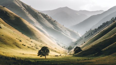 This stunning valley landscape captures the essence of nature's beauty, featuring rolling hills, lush greenery, and misty mountains under a serene sky.