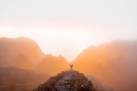 Breathtaking scenery on the mountain range under the clouds and ocean on the background during a sunset. Small traveler figure in the middle