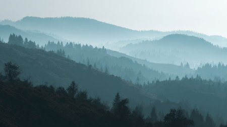 A breathtaking mountain landscape displays layers of misty hills and silhouetted trees in enchanting blue and gray hues, evoking tranquility and peace in nature.