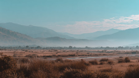 This captivating landscape features misty mountains in the background, a serene river flowing through lush vegetation, and a clear blue sky, creating a tranquil atmosphere.