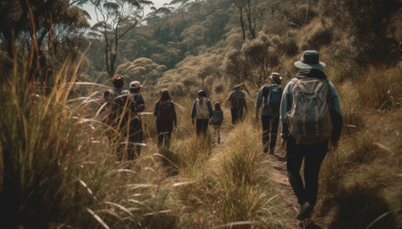 Group of people hiking through mountainous terrain, enjoying nature beauty generated by artificial intelligence