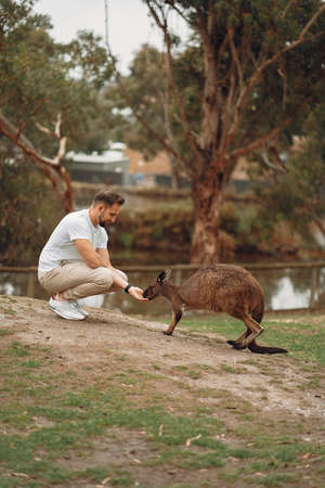 Man in the reserve is playing with a kangaroo