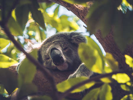 Koala on the smooth bark of a big branch under the leaves of a eucalyptus tree in Magnetic Island, Townsville, Queensland, Australia