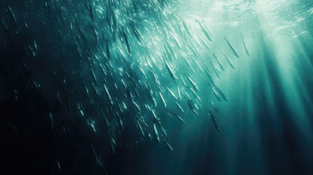 A school of shimmering sardines moving in perfect harmony, creating a mesmerizing dance of light and motion under the sea.