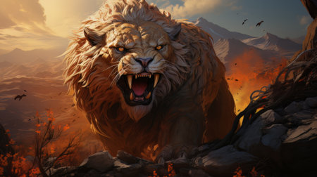 a majestic lion, with its mouth wide open, stands proudly in a lush forest. this epic fantasy-inspired scene captures the lion's strong facial expression and exudes a sense of power and dominance. the image evokes a kingcore aesthetic, with emotionally charged elements reminiscent of a manticore. created by the talented artist ahmed morsi, this artwork leaves a strong emotional impact. ai generated