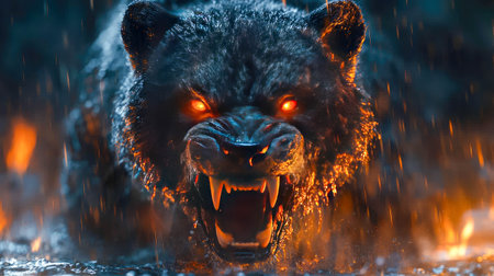A menacing black beast with glowing orange eyes, snarling in the rain with flames reflecting off its fur. Intense and fierce atmosphere.