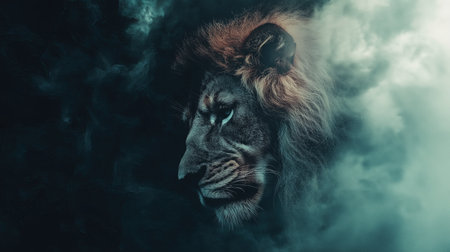 Jesus the lion of Judah. Portrait of a lion in the fog. Filtered image processed vintage effect.
