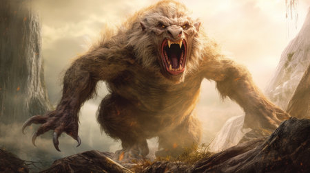 mighty creature, a mix between a lion and a bear, stands majestically with its mouth wide open, emitting a powerful roar.
