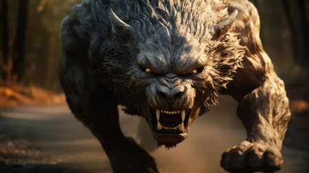 an angry werewolf, rendered in the hyper-realistic style of unreal engine 5, is seen running down a road. the detailed rendering showcases the meticulous linework precision, capturing the dark gray and gold tones of the creature. the image is captured using the angenieux 45-90mm f/2.8 lens, adding to the overall realism. ai generated