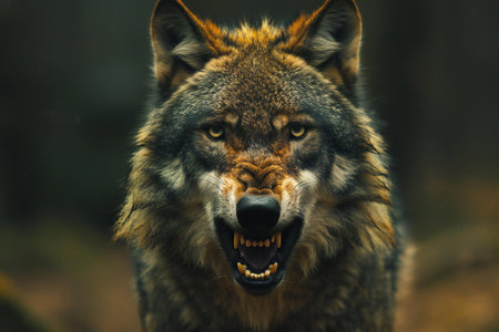 Fierce gray wolf growls menacingly in a dark, foggy woodland setting