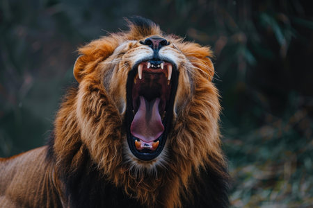 Closeup of a powerful lion midroar, showcasing its fierce majesty